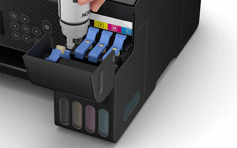 EcoTank обеспечивает удобную и недорогую печать в домашних условиях: чернильные контейнеры сверхвысокой емкости позволяют перезаправлять картриджи без лишних усилий, а бутылки с замком-защелкой разработаны таким образом, что вставить можно только чернила нужного цвета.